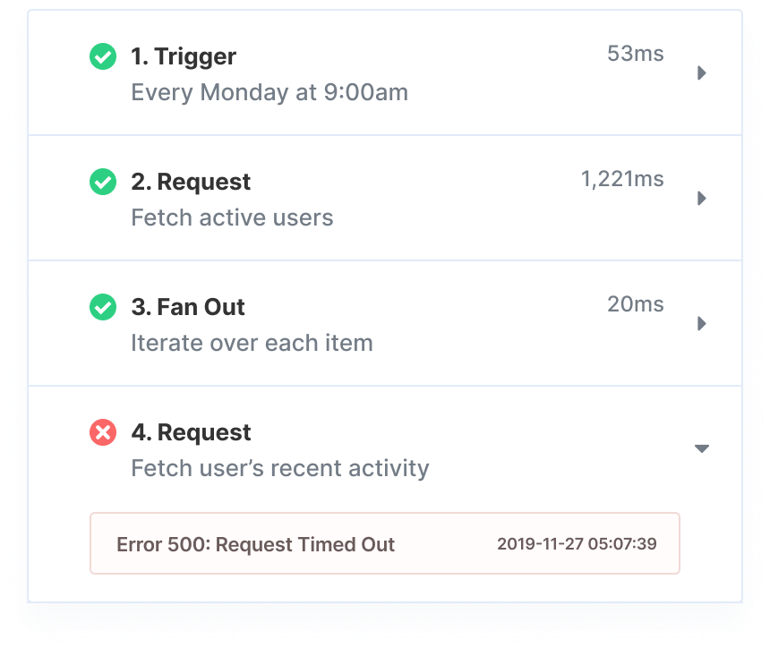 Get event logs for all integration activity, from task executions to syncs and webhook triggers, and easily forward events to your own observability platform.