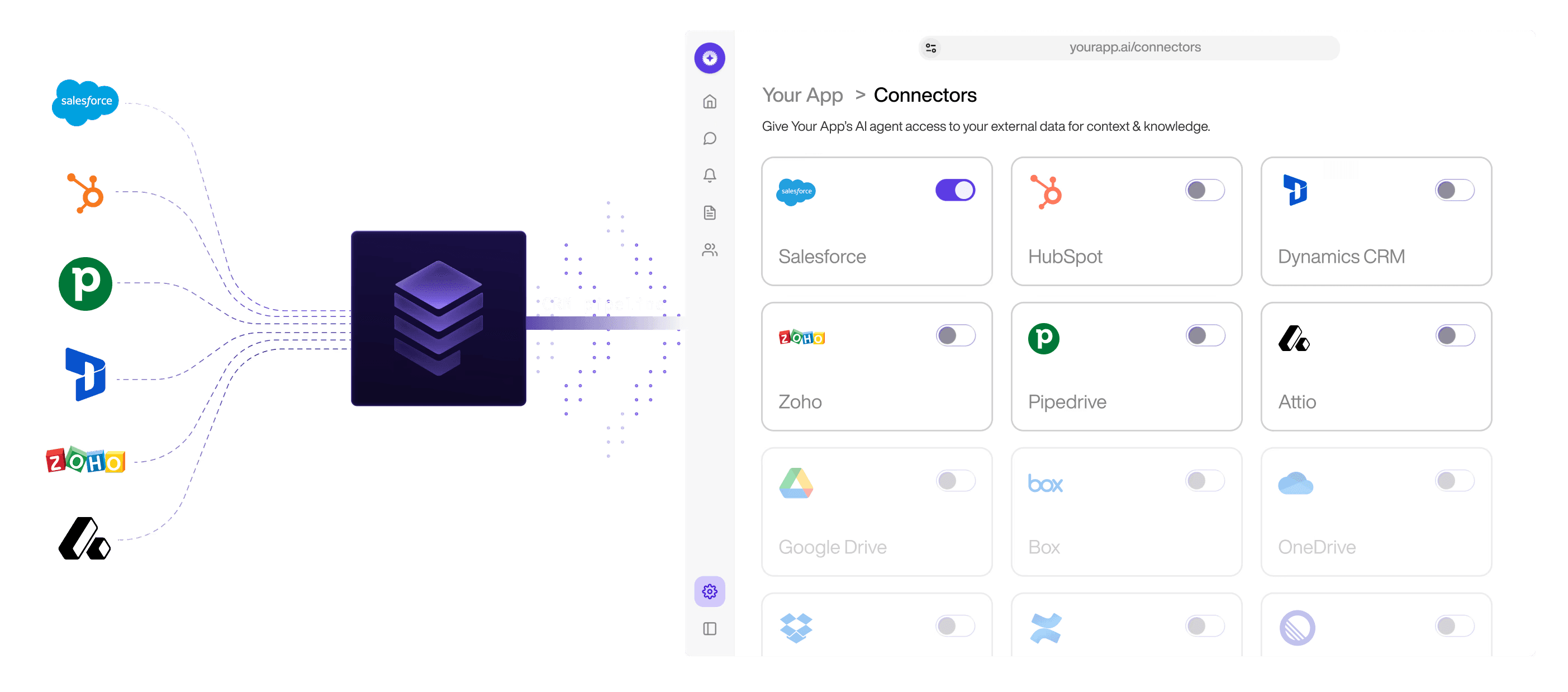 The more context your LLM has on your user, the more relevant and specific your application will be. This process of retrieving context to answer prompts is called RAG, and integrations are the first step to giving your AI application access to the necessary external knowledge. This can look different for end-users depending on the implementation, from enterprise search applications like You.com all the way to customer support applications like Intercom.