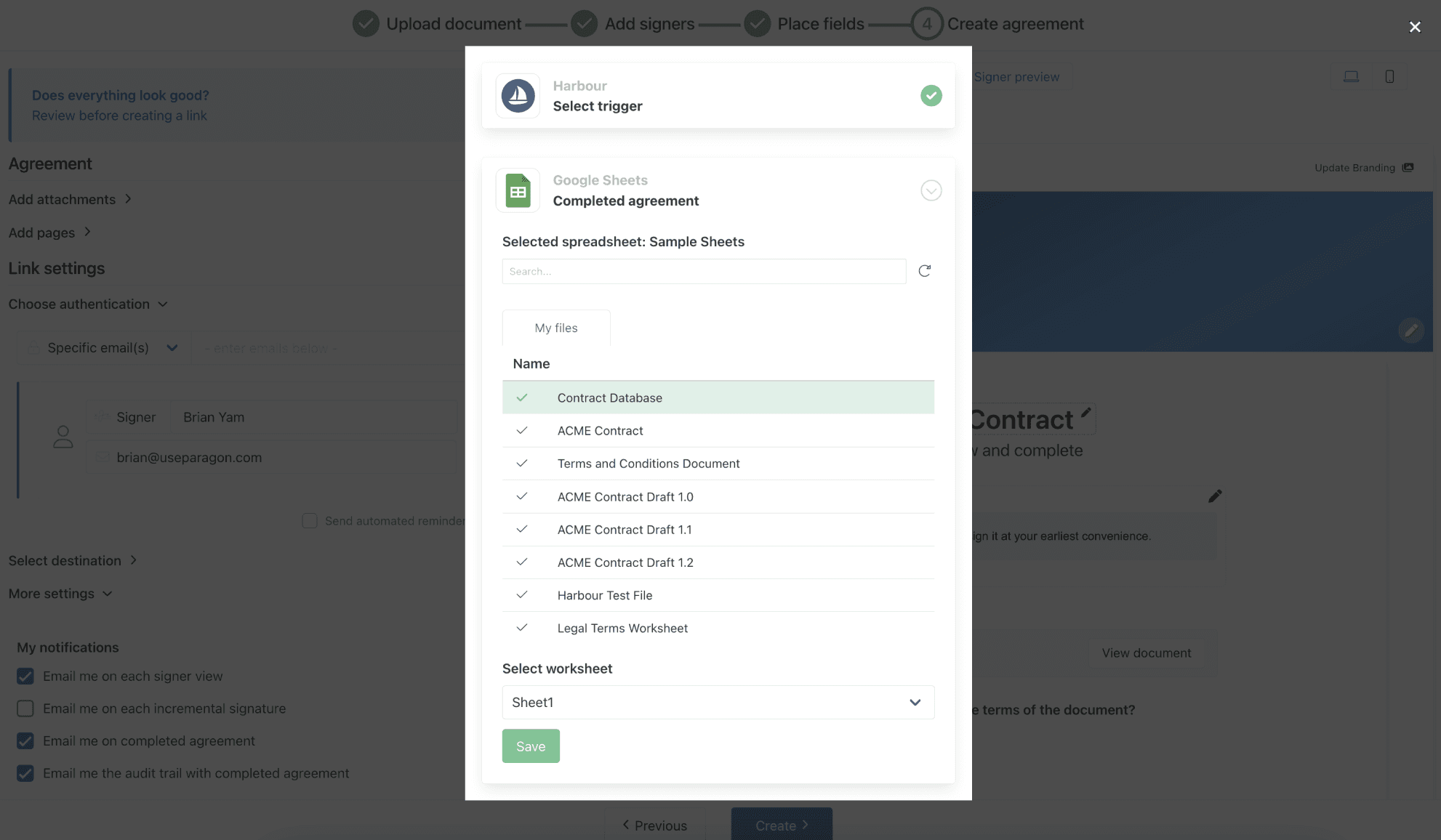 The Google Sheets integration automatically creates a log of events that occur around the contract, so that users can see when a document was signed, and by whom. Harbour used Paragon’s headless implementation and created their own interface to enable users to select the Google Sheets destination, as well as the triggering event(s) that the user wants to have logged.