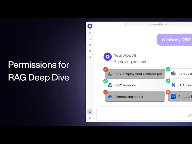 Integrations sound great for AI apps! Hold on though. If your RAG application has ingested your users’ context from all of these 3rd-party integrations, how do you manage permissions to that 3rd-party data?