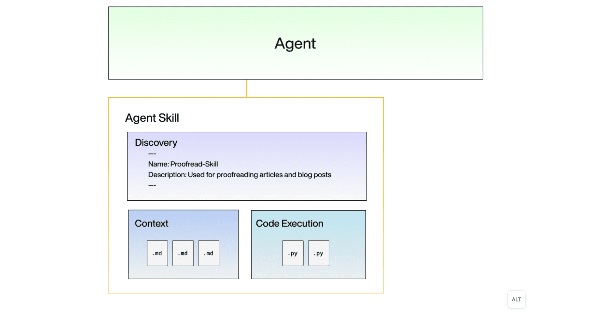While Agent Skills may seem complex, under the hood, Skills are just a directory of markdown files and scripts that conform to the Skills standard. The entry point to an Agent Skill is the SKILL.md file with a name and description at the top of the file. The Skill name and description are the only context loaded with each prompt.